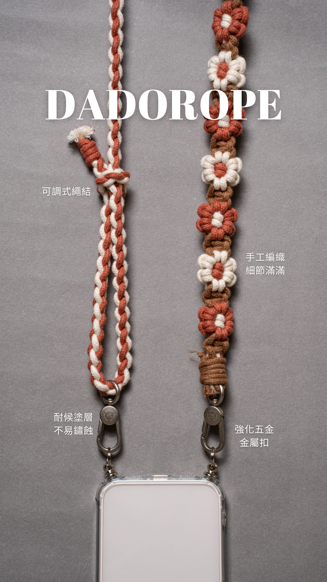 - 繩索皆配備強化五金零件,通用雙扣或單扣。