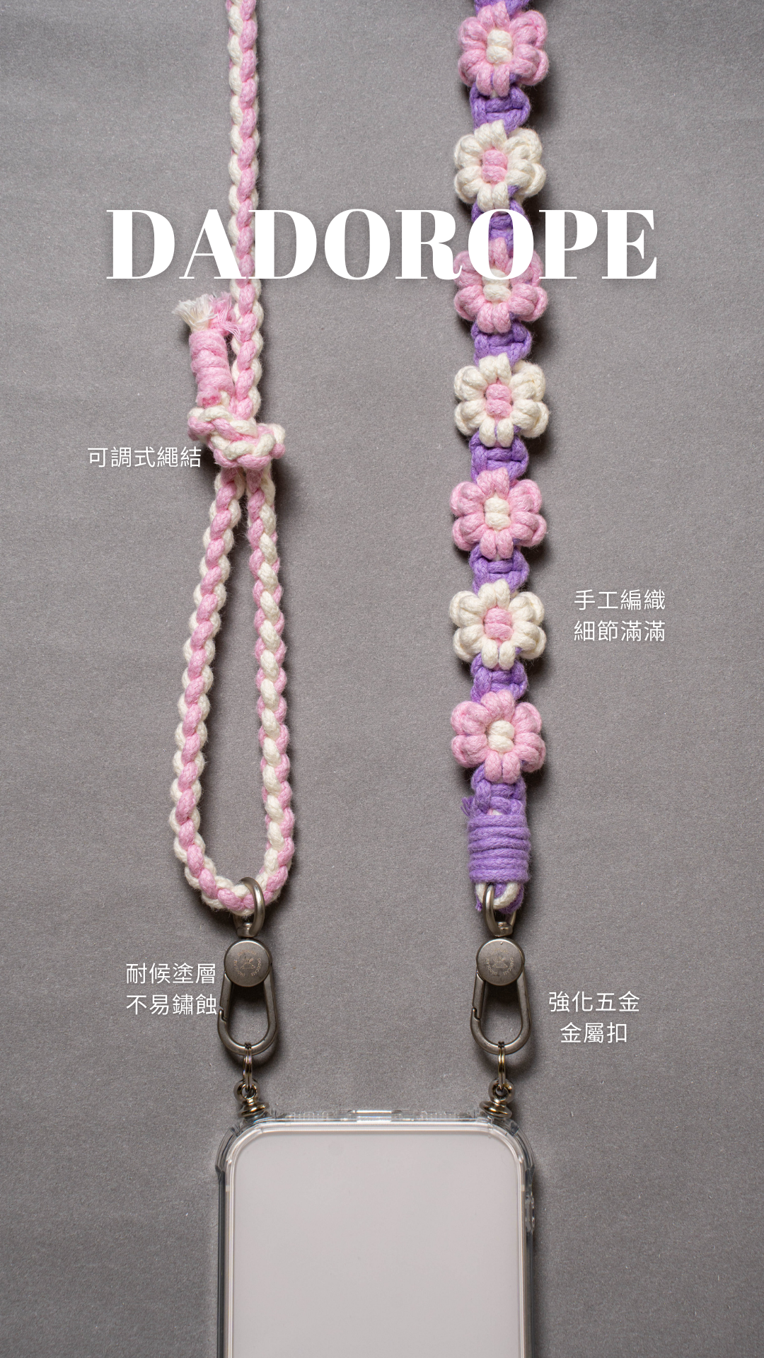 - 繩索皆配備強化五金零件,通用雙扣或單扣。