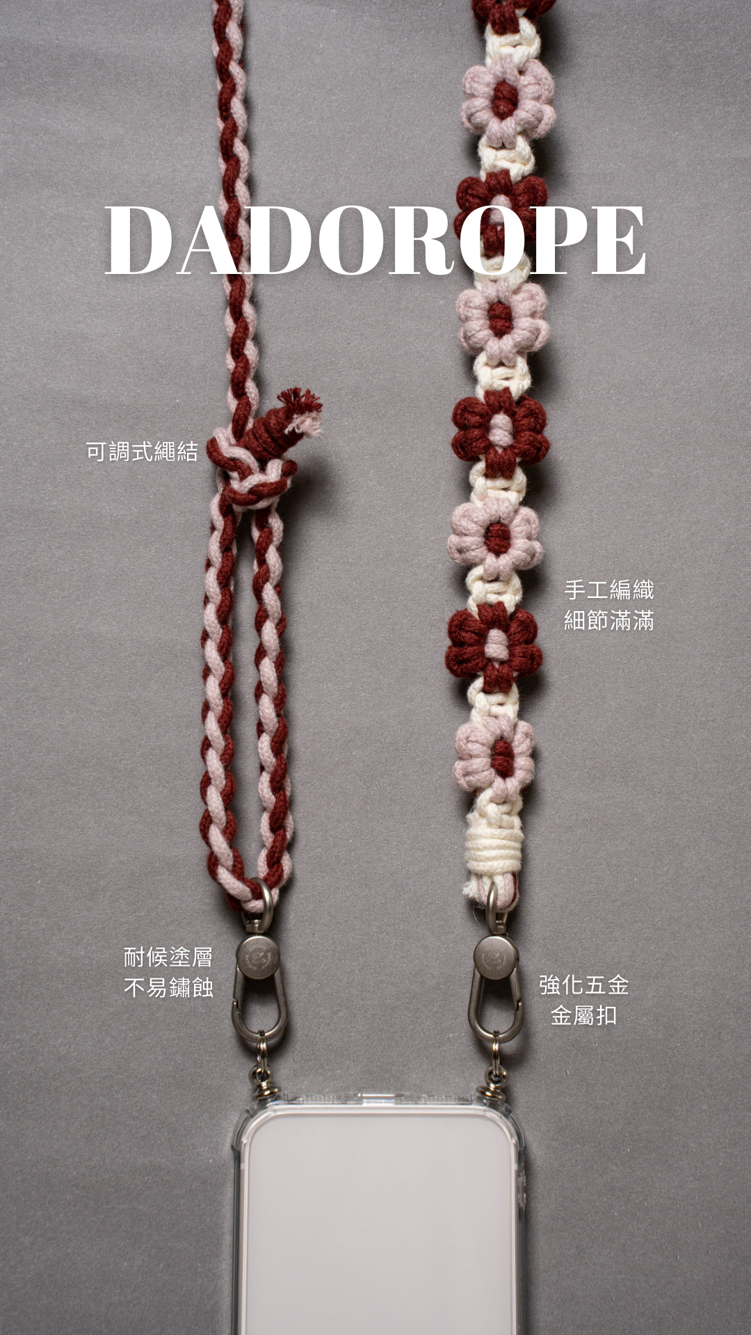 - 繩索皆配備強化五金零件,通用雙扣或單扣。
