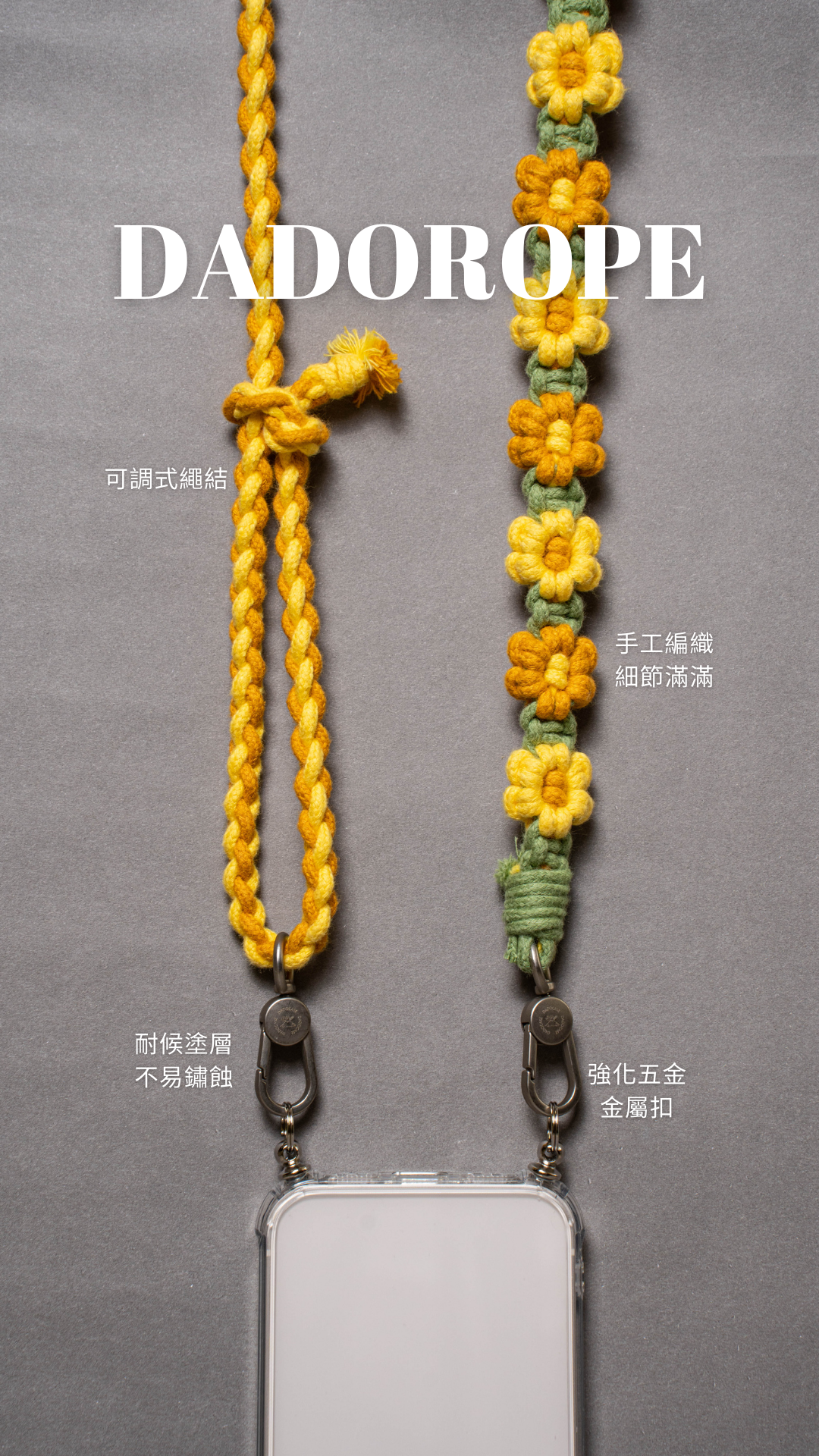 - 繩索皆配備強化五金零件,通用雙扣或單扣。
