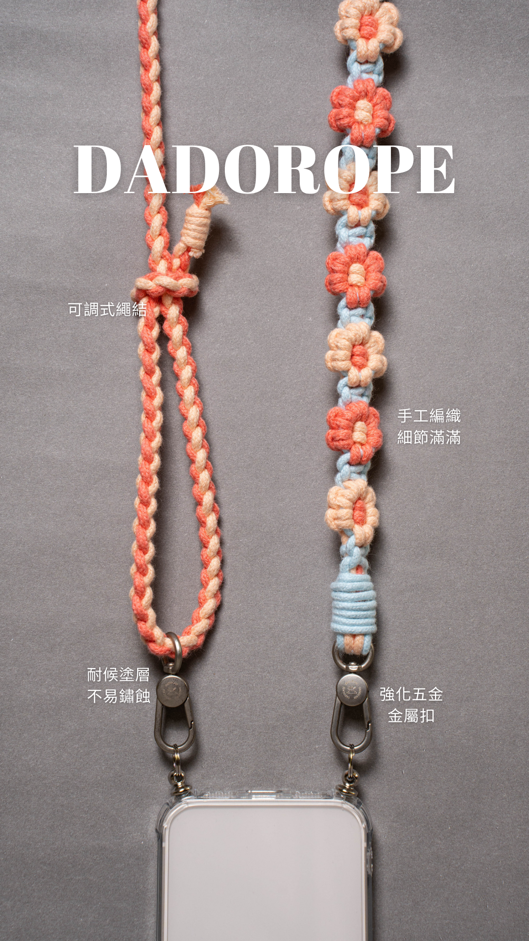 - 繩索皆配備強化五金零件,通用雙扣或單扣。